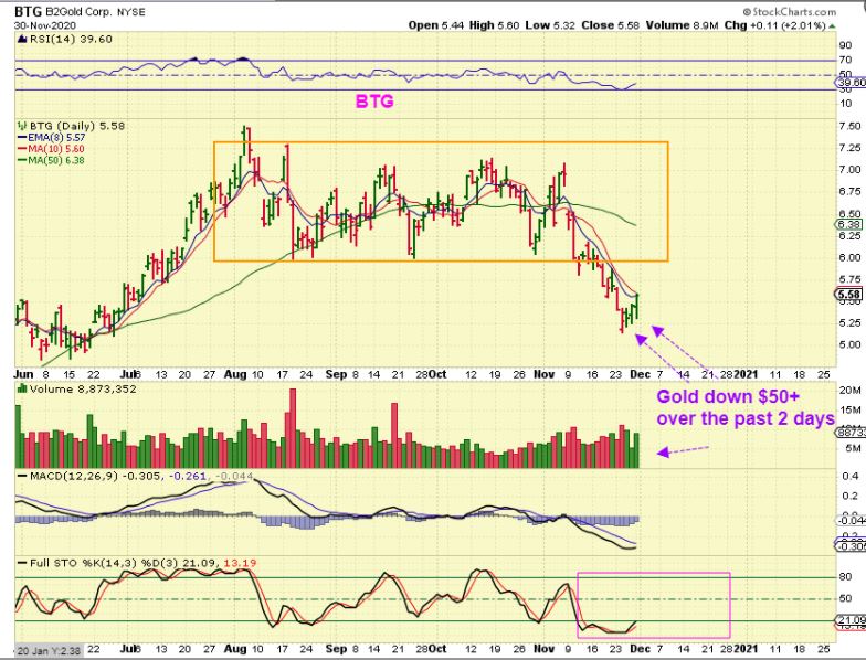 BTG DAILY – I see a Miner like BTG curling upward during the last 2 days of Gold selling and it also looks like accumulation. Buying this with a stop under the lows is ok, but this could be a bear flag. It just seems like if it was a bear flag it would have broken down with Gold down well over $20.