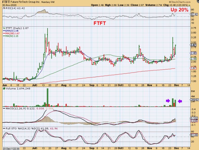 I mentioned that I bought FTFT, also on my Blockchain list with MARA, RIOT, GROW, HVTF, SI, etc. I love a nice long consolidation and would love to see a break out & run with FTFT too. I cannot tell if Bitcoin is going to keep running or put a handle / consolidation in, but these block chain stocks can still benefit during a normal consolidation.