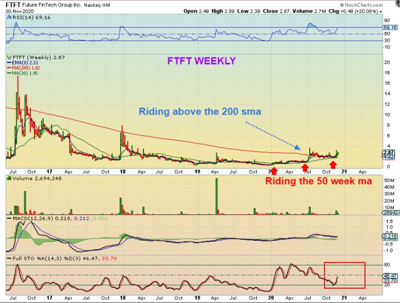 FTFT WEEKLY The Longer Term potential is also very promising here, but I’ll take it one step at a time. If Bitcoin does a big pullback along with other Crypto currencies, These (FTFT, RIOT, MARA, etc) may continue to pop & chop. This also can do what Riot did – a run from $3 to $9.