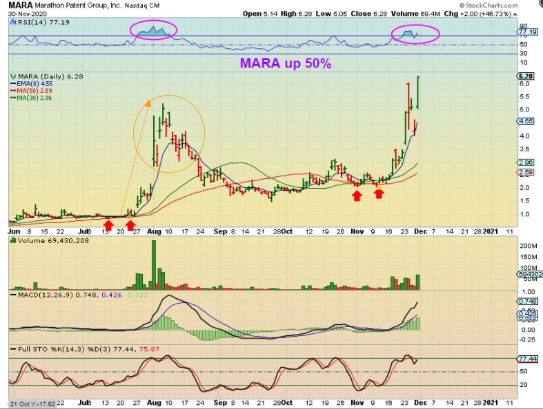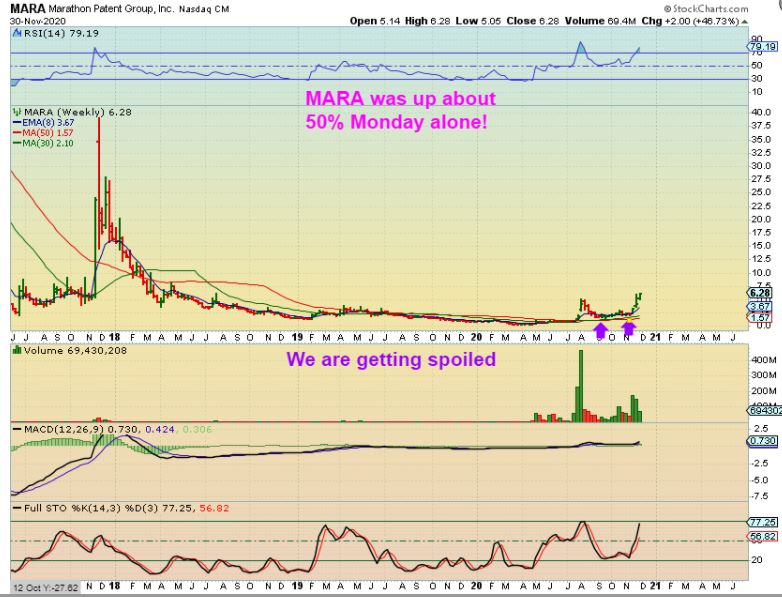 MARA DAILY – For those still holding MARA & RIOT, they were up big yesterday. MARA was up almost 50% Monday alone as BITCOIN hit new all time highs. I feel that this is too extended to ‘enter’ a new position up here, since a pull back can happen along the way, but…