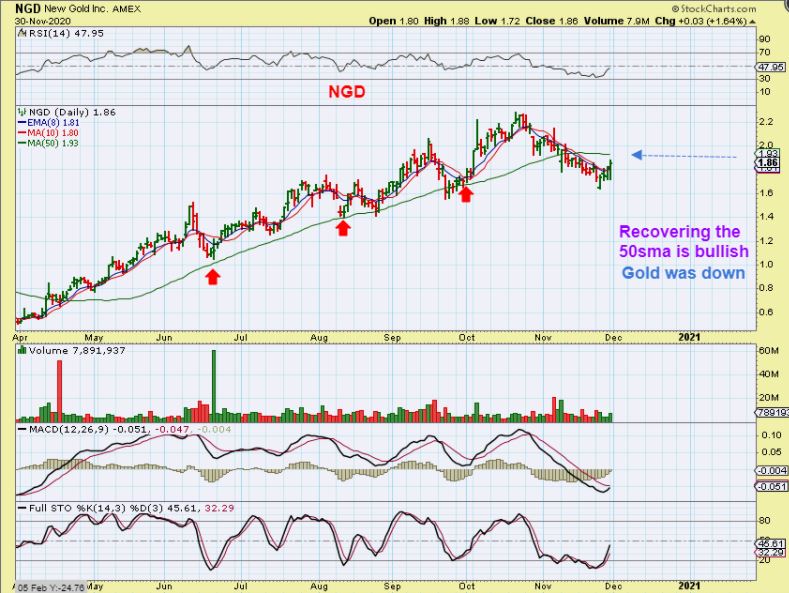 NGD is actually a bullish looking set up because after a nice solid rally, it lost the 50sma and suddenly looks ready to try to re-gain it back already. This push higher happened as Gold sold off too.