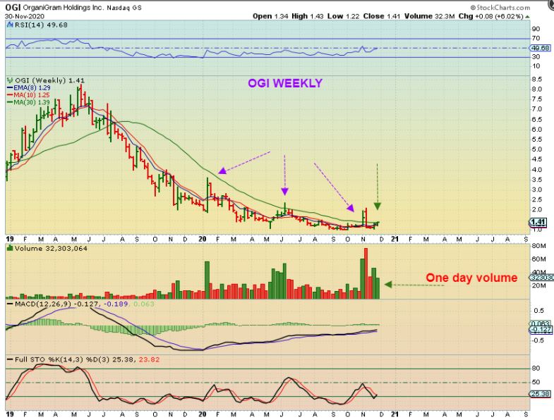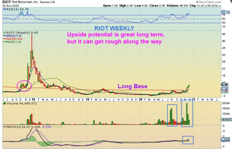 RIOT WEEKLY – Riot was up 35% Monday alone too and volume is excellent. I do want to point out the circle on the Left Side of the chart. It just shows in the past that before the massive ramp up higher we saw a multi week pull back to the 200 week ma. The ride isn’t always easy, but it has been extremely rewarding. We were buying this in the $3-$4 area and it is heading to $10 pretty quickly. I received emails from a few that are still doing very well here. Congrats!