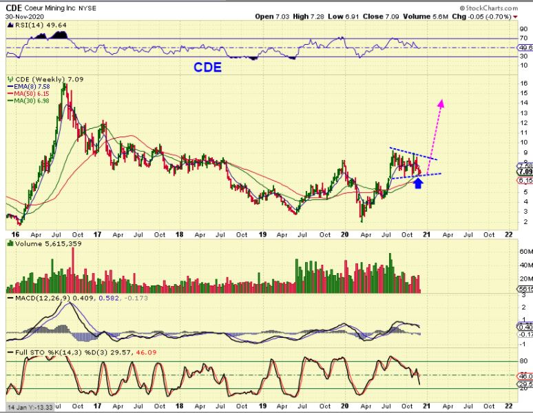 CDE WEEKLY – I would say that CDE could easily rally over 100% once it breaks free. $7 to $14 is easily possible. $7 to $21 is not out of the question. But will Silver break lows and have some Silver stocks shake out first? That is possible too. So can you buy? That is up to you!