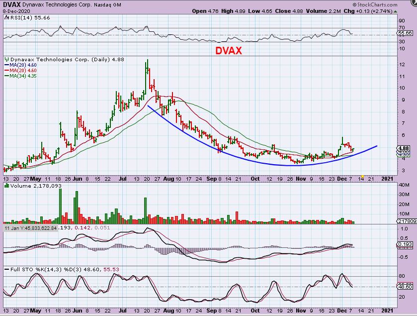 DVAX – Rallied higher and then dipped down to back test the 20sma. I hate the ‘$4 to $6 and back again’ too, but this does look like a Buy here again. It may be choppy as it forms a giant cup out of this base. I still like DVAX, CHFS, RGLS, BIOC, HTBX, and a few others as Covid play candidates.