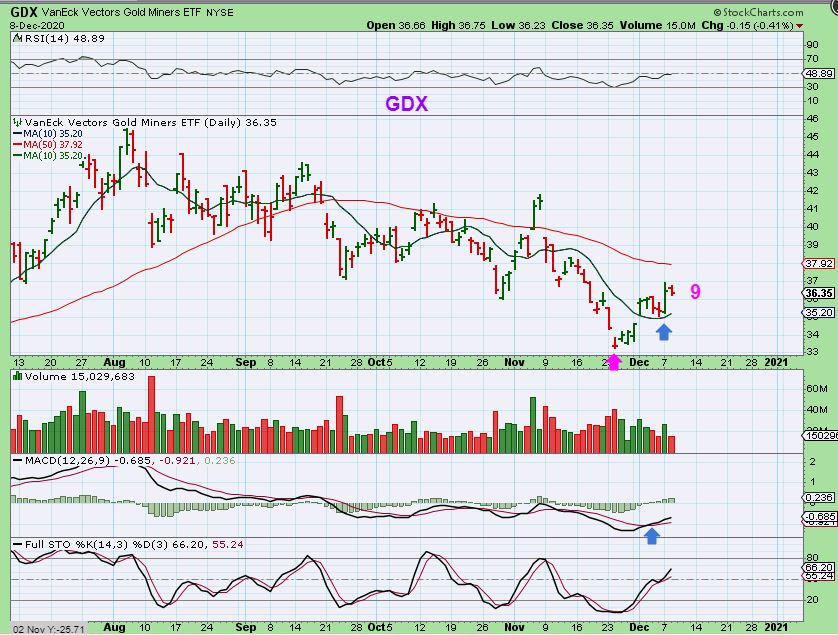 GDX has pushed out of the lows, broke above the 10sma, and then dropped back down to test it. Monday saw a nice strong move off of that 10sma and Tuesday gave us a chance to add to Miners. This is day 9.