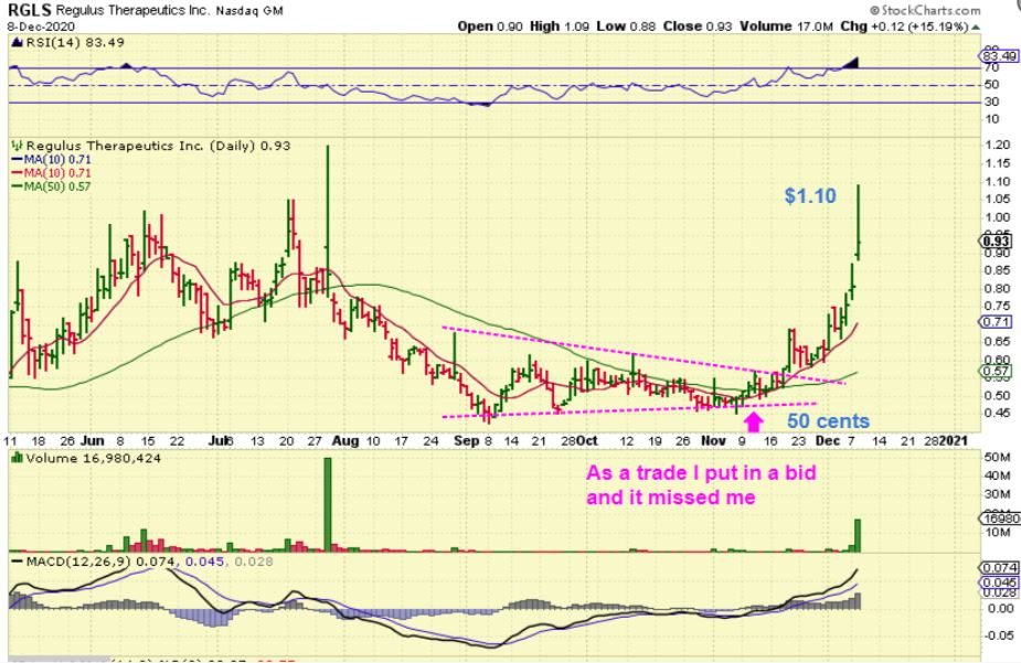 RGLS: I had a bid in for this triangle base set up and it missed picking me up. I didn’t want to chase it on that POP break out so I waited for a dip & missed it again. It is now up 100%. I missed it, but this is why I am hoping that AIKI, CHFS, NOVN, or another still in the base will follow through like RGLS, TRXC, etc.