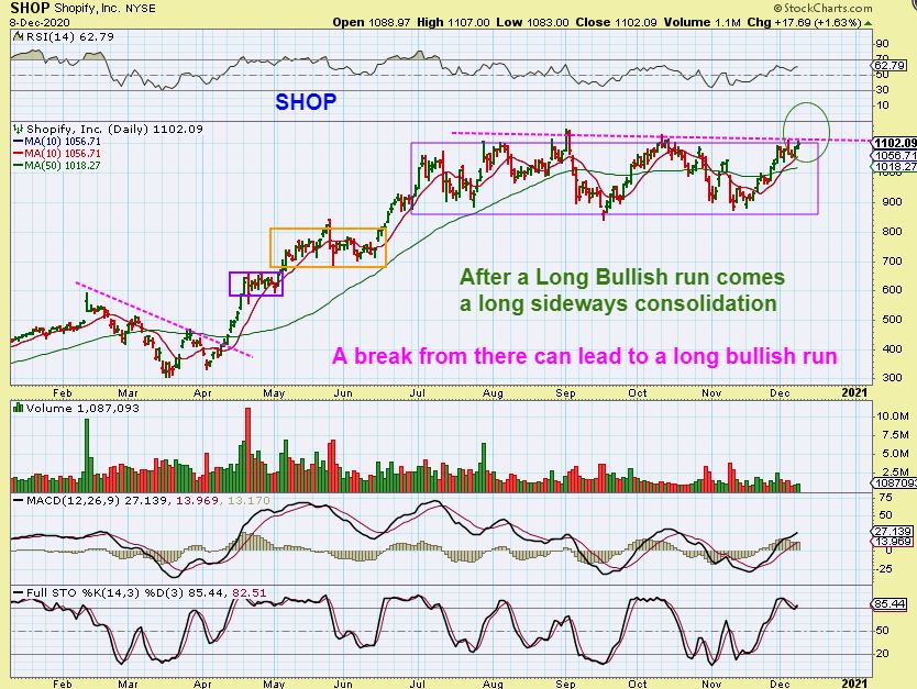 SHOP – Shopify ran from $300 to $1000 from March to July! It has now been chopping from $800 to $1000 since June. A break from a consolidation like this can lead to another solid run higher, so you may want this on your watch list (Buy the break out).