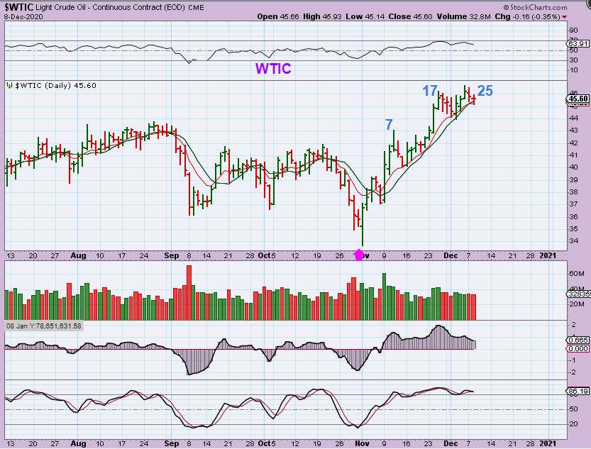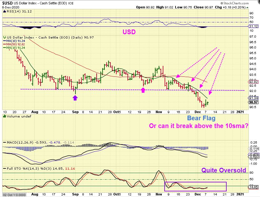 THE USD – This is hard to read lately. The USD sold off sharply in November, but Gold didn’t rally sharply higher. Now we have a small bounce for 3 days and Gold has a couple of green days at the same time. Tricky. I would say that the USD is very oversold & is also due for a dcl and a good bounce, but as long as it remains unable to get above that 10sma, it is trending lower.