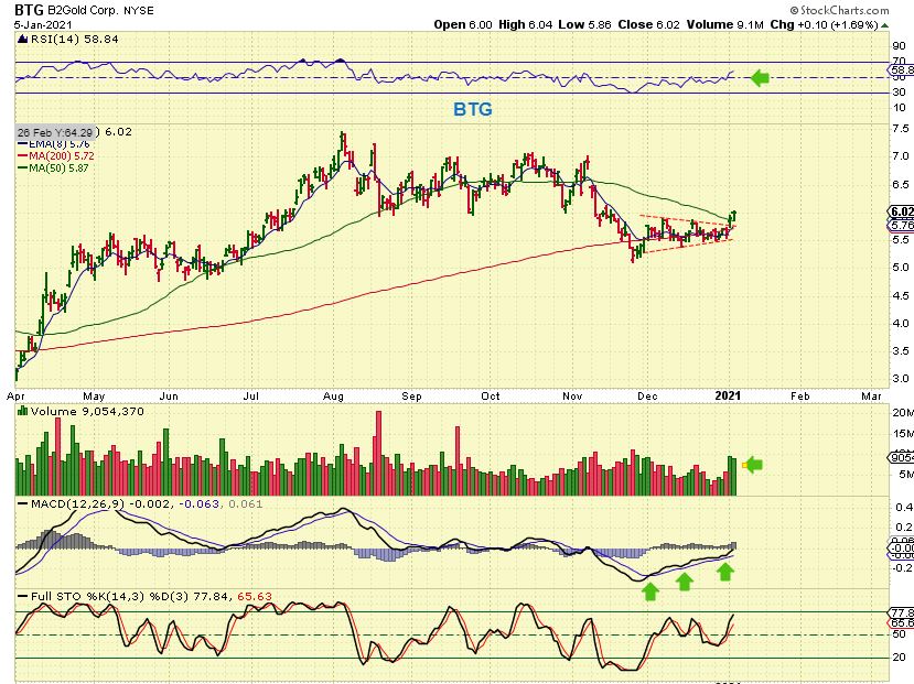 BTG– Pushed higher above the 50sma. If you look around at your list of Miners, we see that some Miners were up and others seemed to pause.   I am not bothered by the fact that GDX was red for the day since the red miners still look Bullish.