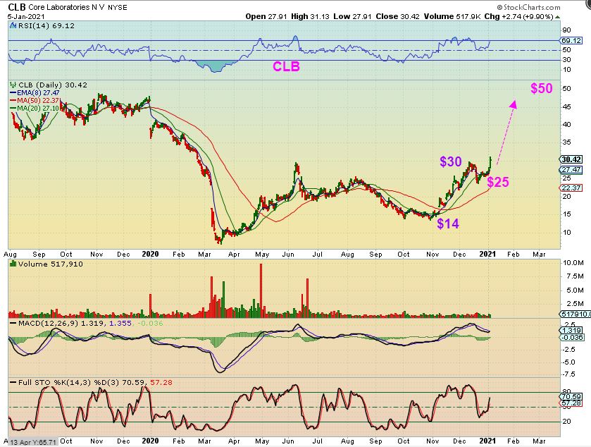 CLB – I know that it says ‘Core Laboratories’,  but they engage in the provision of proprietary and patented reservoir description, production enhancement, and reservoir management services to the oil and gas industry. They are an oil services stock that no one wanted to hold when oil crashed too.  It rallied $14 back to $30 in November to December and then  dipped to $25.  Back to $50? Very possible and at the least worth a trade even if it went from $25 to $45.