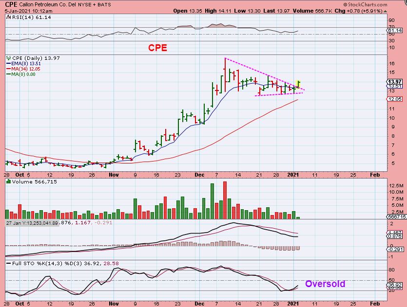 I also grabbed this chart 1/2 hr into trading.  CPE did a reverse split in 2020 and then ran from under $5 to $16 in 2 short months ( I Bought this one in November). After a consolidation it looks ready to run again.