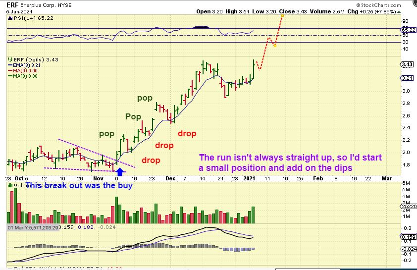 This is ERF again: Notice that it isn’t usually isn’t as much of a straight run higher as it looks. It pops and drops often near the 8 ema or 10sma.  I often buy a small starter and add when I can. I do this with any stock ( Oil, Miner, Tech) that Pops up 10% above the support level.