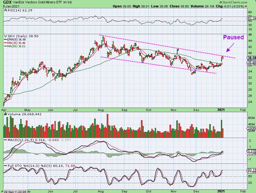 GDX – Some Miners made progress Tuesday and yet others lingered a bit, so the GDX ETF was actually red. Mondays strong volume push higher made it look like Gold stocks would catch up to the nice rally that the Silver stocks have had, but it paused at the top of the channel.  This gave buyers more time to buy low as Price stalled at the top of the channel.