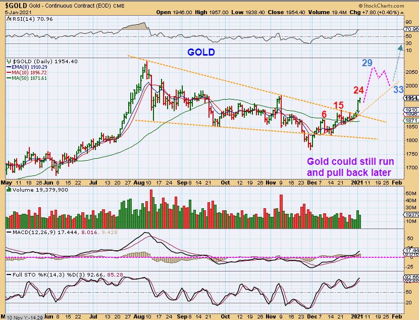 GOLD pushed a little higher on day 24 and it can continue higher. In fact, let me show you 2 different possible scenarios that will help us to visualize things better no matter what Gold does from here.