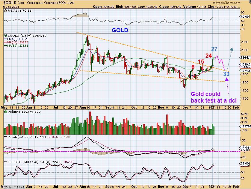 GOLD  – A RUN TO 2020 highs is still a valid possibility.  I do think that on day 24 Gold can still rally and complete the cup formation that it is working on. It could run to the 2020 highs and then pull back for the DCL (Daily Cycle Low) somewhere around day 33 timing for a dcl as shown.