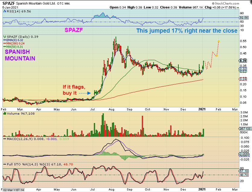 SPAZF – This one was doing nothing all day and in the last 15 minutes it jumped 17%, so we’re just waiting for Buyers to continue to step in. As for SPAZF, you could start a position here and if it stalled or flags you may want to add to it. That is what it did when it popped in July.