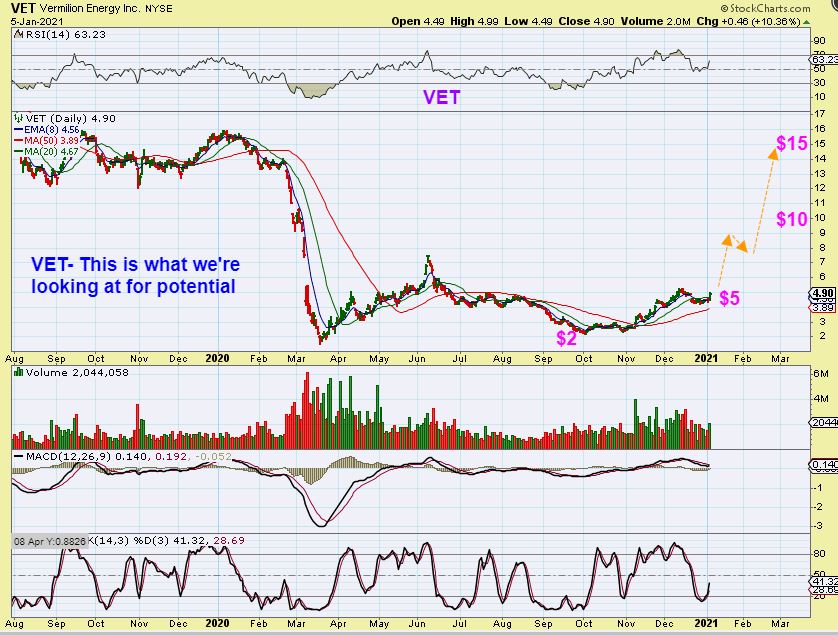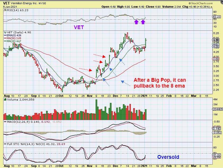 VET – I look at a stock like VET and see that after a double bottom near $2.25 it then rallied nicely and more than doubled. Now it has pulled back for over 2 weeks and surged higher again. That is a low risk buy as it regains the 8 ema or 10sma and breaks higher, but let me show you something else…