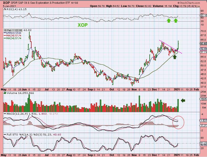Boom! The XOP was up 6.4% in a very strong looking high volume break out. This should be our 2nd daily cycle and all of the Oil stocks were just as strong yesterday.  I will show that at the end of todays report, they can be bought here.