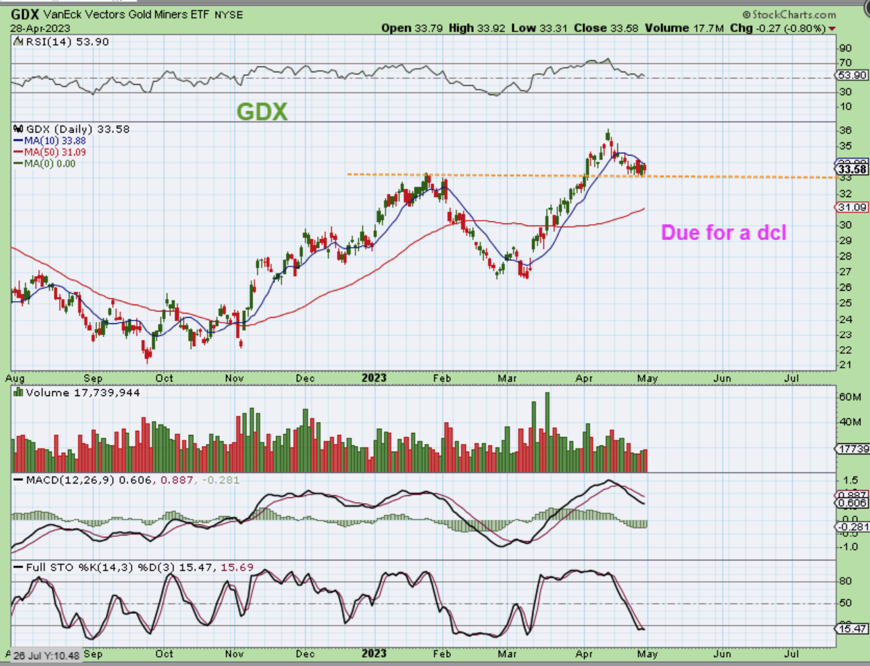 THE GDX daily is due for a dcl right now. A move above that 10 sma should signal that the lows are in place. That means that instead of a deeper dcl, it may have simply back tested the prior January highs. Notice that the RSI pulled back to 50% and the Stochastics made it to oversold. This is textbook bullish price action so far.