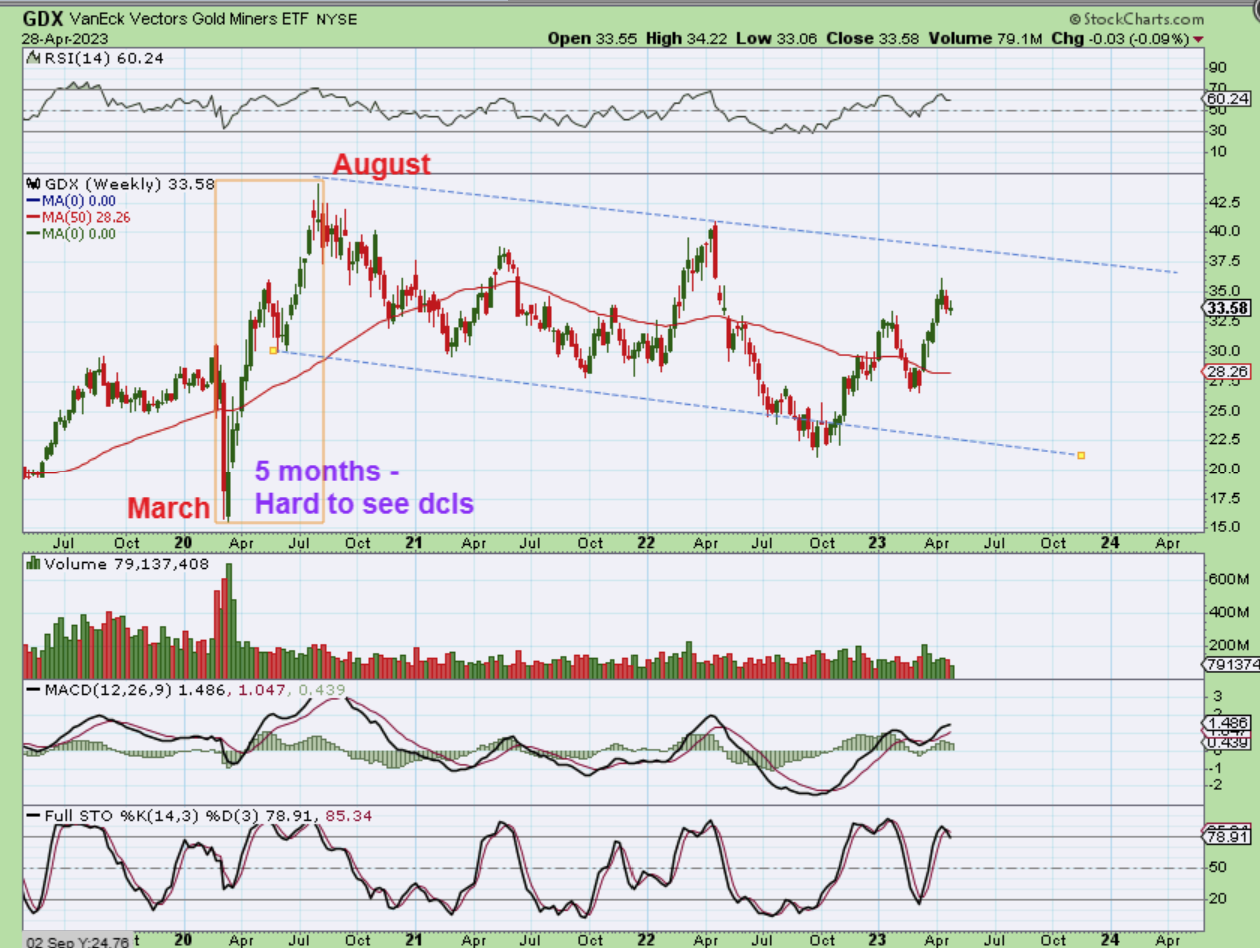 THE GDX WEEKLY CHART shows a doji, but with a dcl likely in place, this should run higher on Fed Week, and as you can see, it has room to run. Some may think that this dip was too shallow to be a dcl, but when I look at the run from 2020 March to August, I hardly see 4 visible DCLs, but we should have roughly 1 per month during that time.