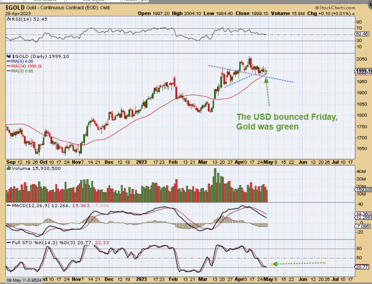 GOLD DAILY – Gold dipped to the 34 sma and bounced back on Friday to close green.