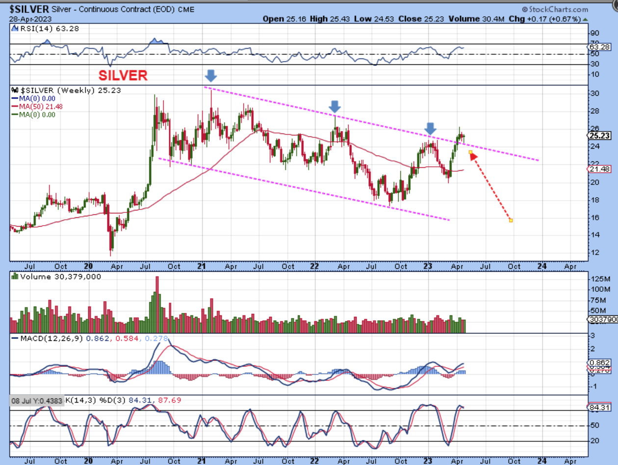 SILVER WEEKLY – Silver broke out from a downtrend and this weeks dip to find a dcl on day 33 caused a back test. If we just got a dcl on the daily chart, Silver should push higher to prior highs, but…