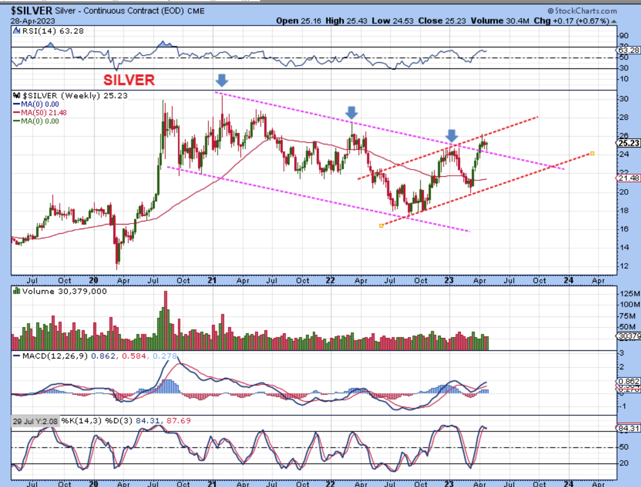 SILVER – Will silver just ‘chop’ higher, running along the upper trend line that just formed? Or will it blast through and leave this behind as a basing pattern? Stay tuned.