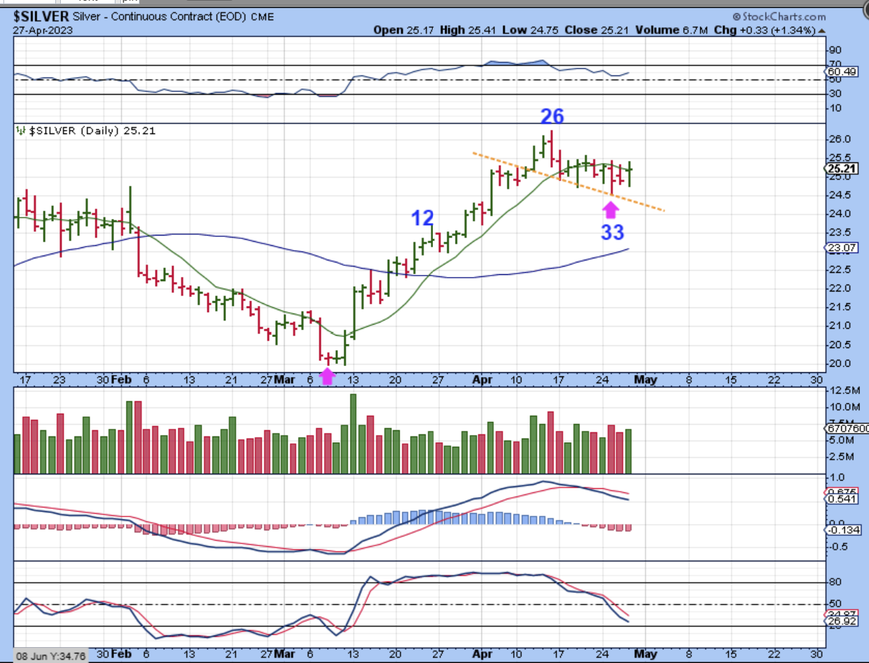 From Fridays report, THE SILVER DAILY: Silver is due for a dcl. Day 33 may be that dcl. The pull back has been very minimal, very bullish, so I would guess that the Silver stocks would do very well on the next rally.