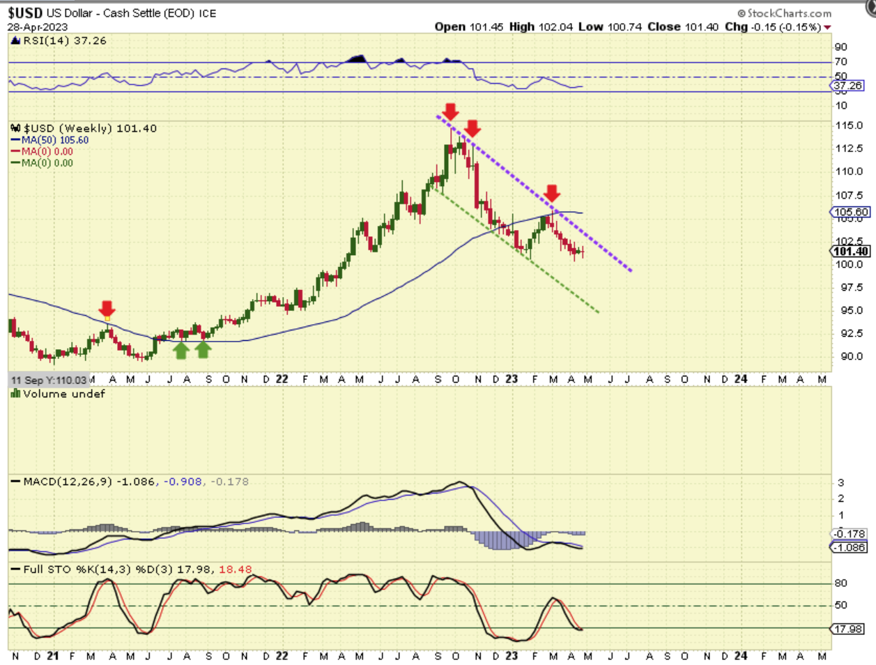 I have been calling for a drop to possibly $90 as the USD falls into a 3 yr cycle low. That low is not due until Jan 2024, but with all of the fed Manipulation of Rate hikes and monetary policy, I cannot rule out that it arrives a little earlier or later. So far, as seen here, the 3 yr cycle low has been a consistantly reliable tool.