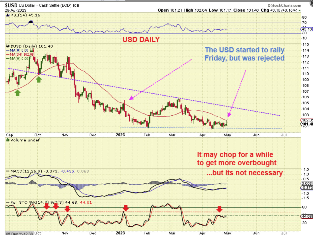 USD DAILY – The Dollar Popped up on Friday, but it was interesting to note that Gold and Silver did NOT drop all that much when the USD was up nicely. Soon after the markets opened in the U.S., The USD sold off again and as you can see here, it tagged the 34 sma and was rejected.