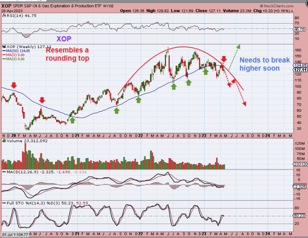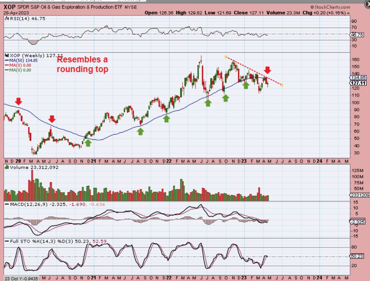 A true rounding top is bearish and I have to admit that this is what I see as possibly developing here ever since the XOP was rejected at the 50 week ma. Basically, this needs to break out above that 50 week ma to negate this topping pattern, and that could happen as soon as next week too.