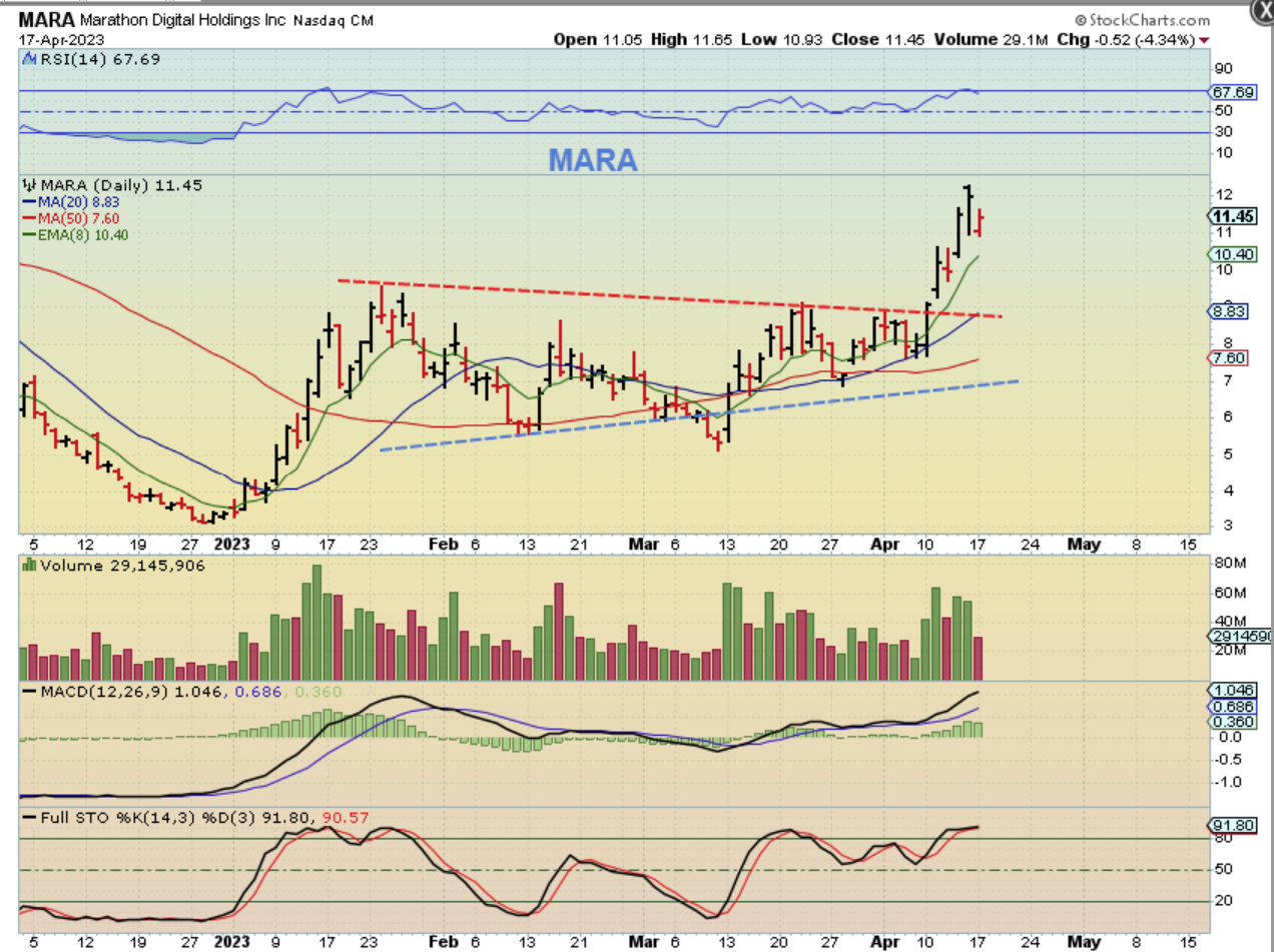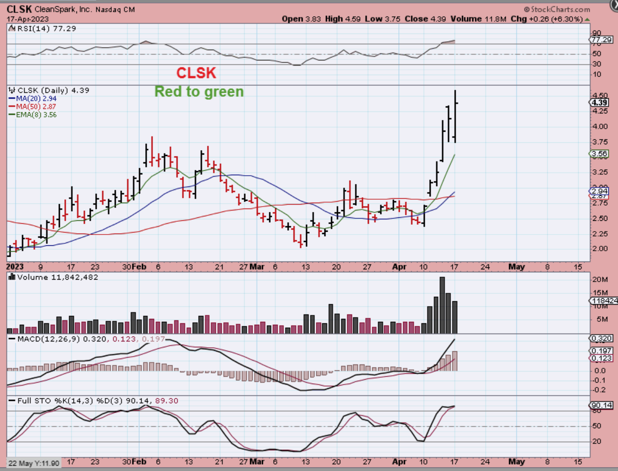 CLSK may be getting a bit extended here, but it started the day quite red with a big gap down, and then it recovered with a nice sign of strength. It has very good volume.