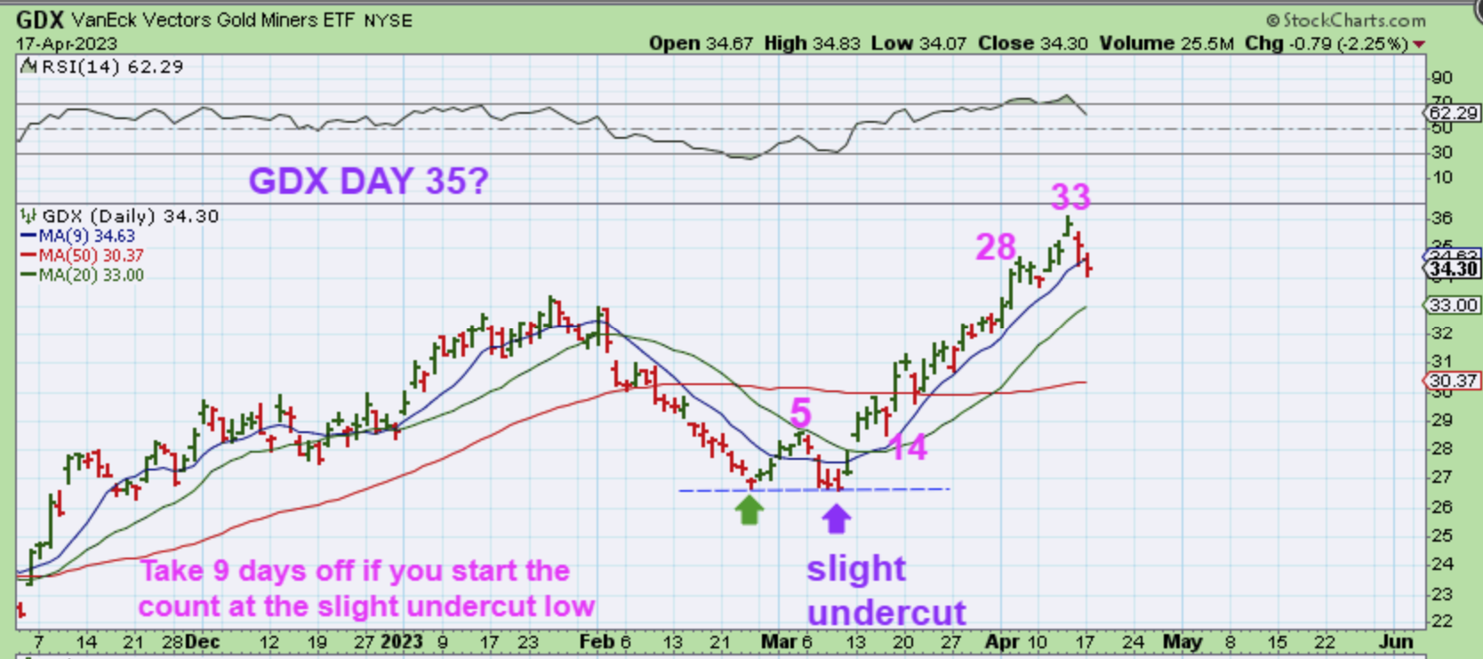 GDX – If this is day 35, a dcl is slightly overdue. If I go by the 2nd low, it matches closer to Silver, so lets just say that