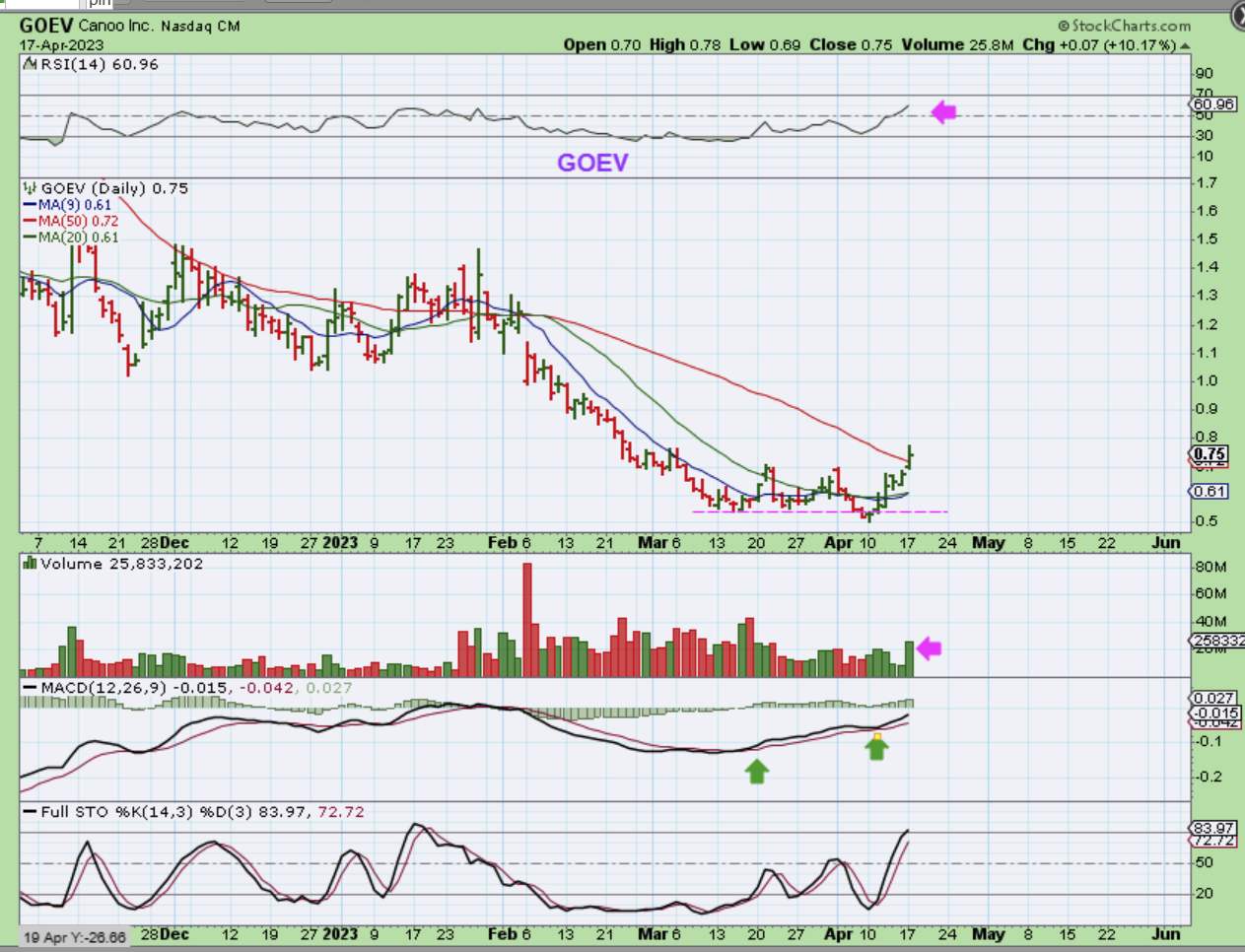 GOEV has been up for 5 days in a row and one of those days was up 11%, this one yesterday was over 12% at one point. GOEV is now up 50% in that time period. GOEV became a 50 cent stock, so not all want to buy it, but I just wanted to show how deep the selling was and much potential these may offer. Buy them and raise stops along the way.
