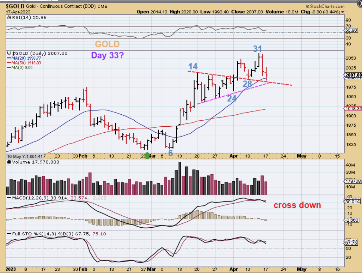 GDX is similar to Silver with a strong run that never broke the 9sma until now. I don’t expect a huge dip, so while the USD chops higher, Miners become a buying opportunity. Will GDX reach the purple support? Will it also reach that green 20sma line? If you see a reversal there, it will be within the timing for a dcl, so Miners will be a buy the dip opportunity. Let’s look at the ‘cycle count’…