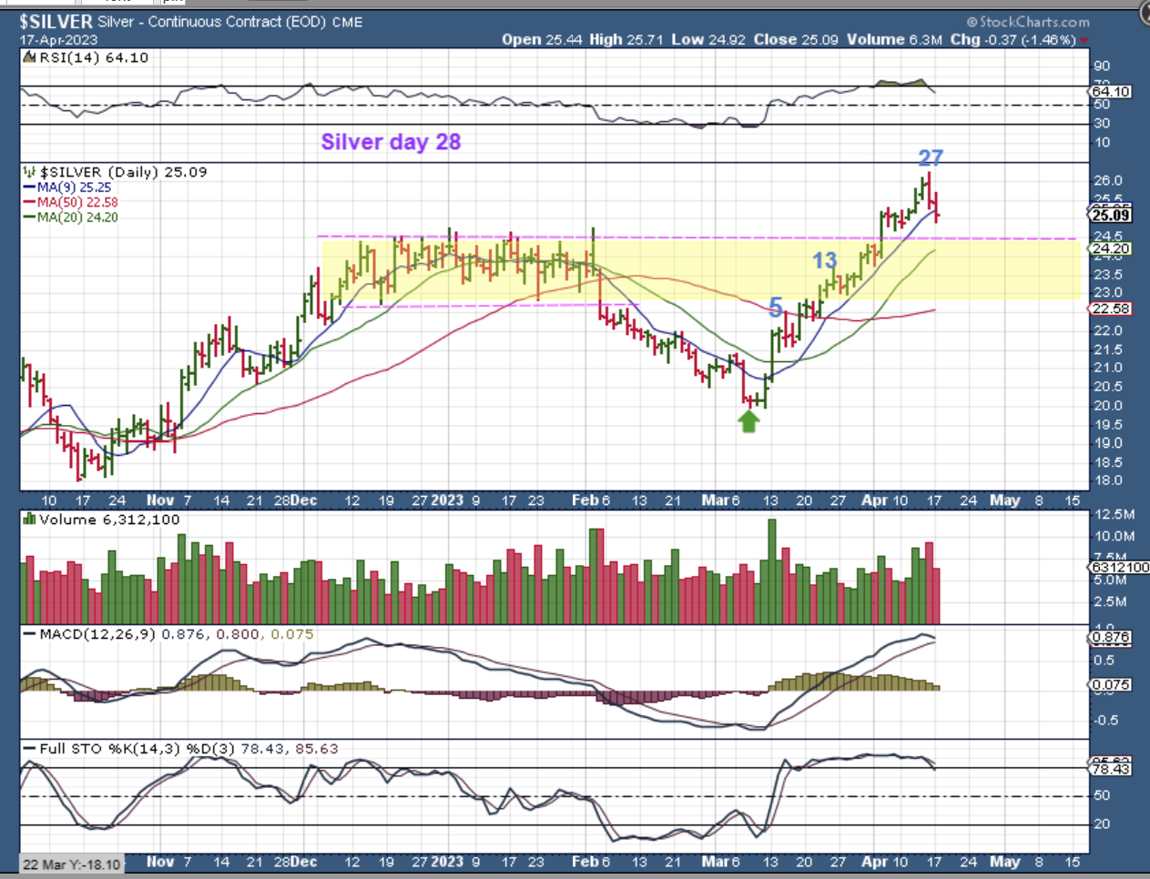 SILVER is due for a dcl and is finally dipping down on day 28. It has not broken below the 9sma until now, so here comes a buying opportunity if you didn’t buy at the 50sma. I’m not expecting a really deep dip, so I added that 20sma here and the yellow choppy area, and either can act as support.