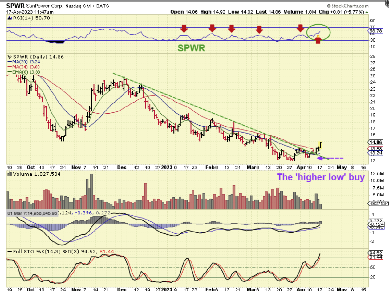 SPWR– On April 11 I used this chart to show the long term buy and hold with good potential. It was $13.44.