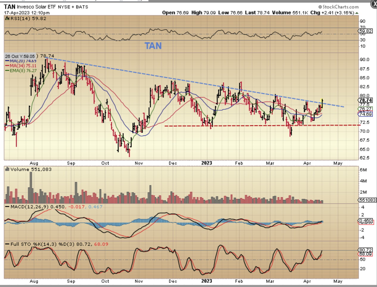 I want to point out again that the Solar Sector is bullish. I did have some of the Solar Stocks in a report not long ago, but they have been a little choppy rather than running straight up. Yesterday the ETF TAN started to break out from a downtrend as another buy opportunity. See the charts of SPWR, CSIQ, RUN, SOL, FSLR, ENPH, DQ, etc.