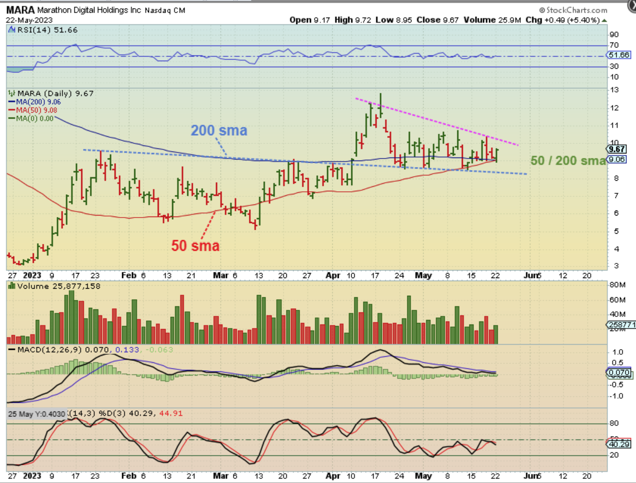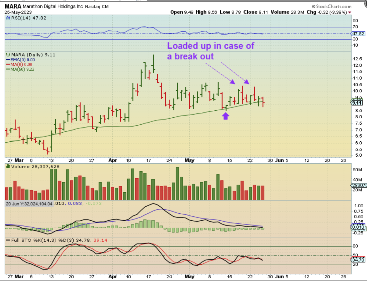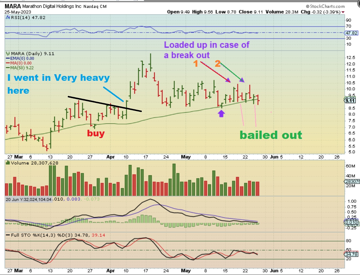 1. See the blue writing: In early April I went in Very heavily at the MARA break out and made very good gains on that rally ($8.50 – $12.50 on the breakout alone)