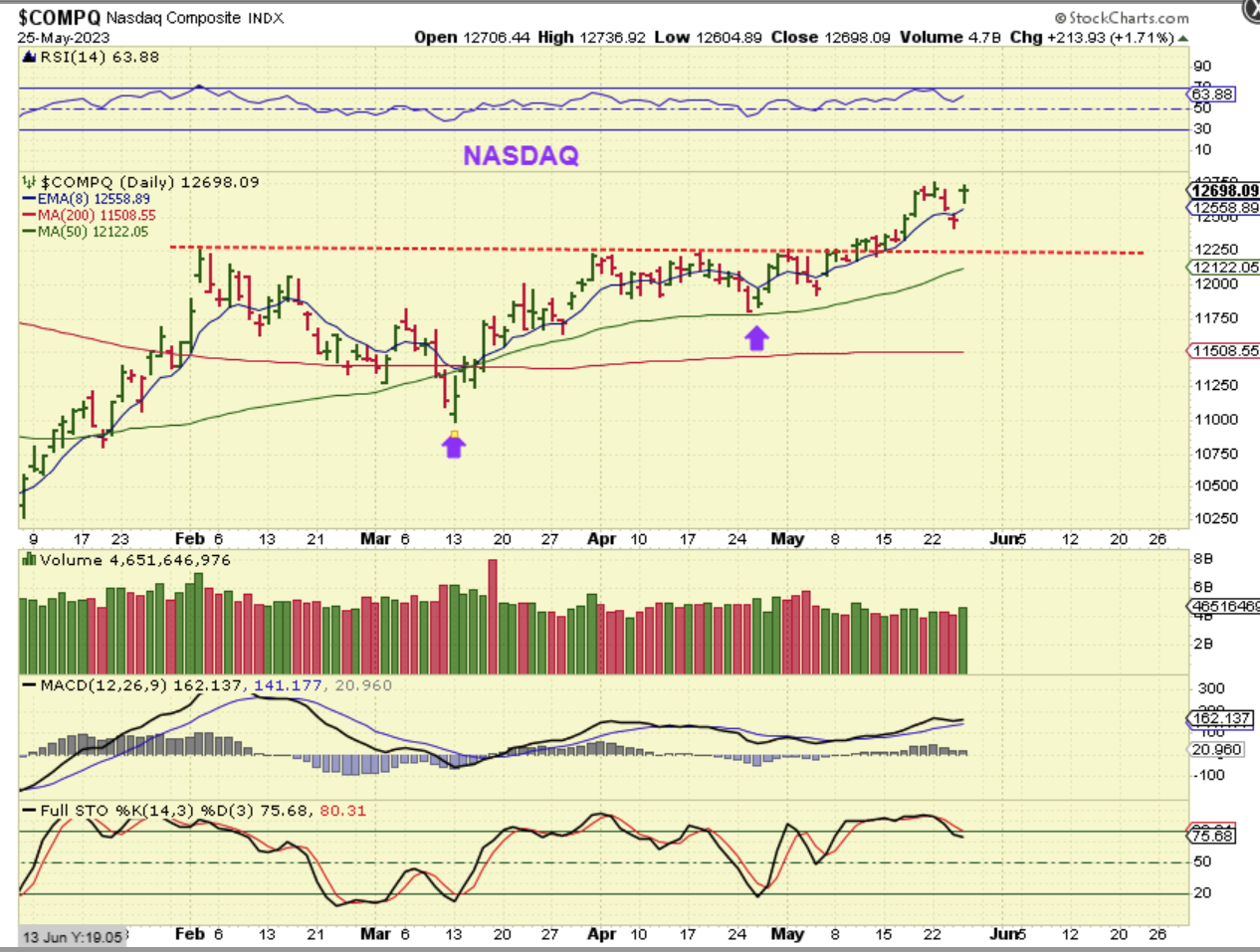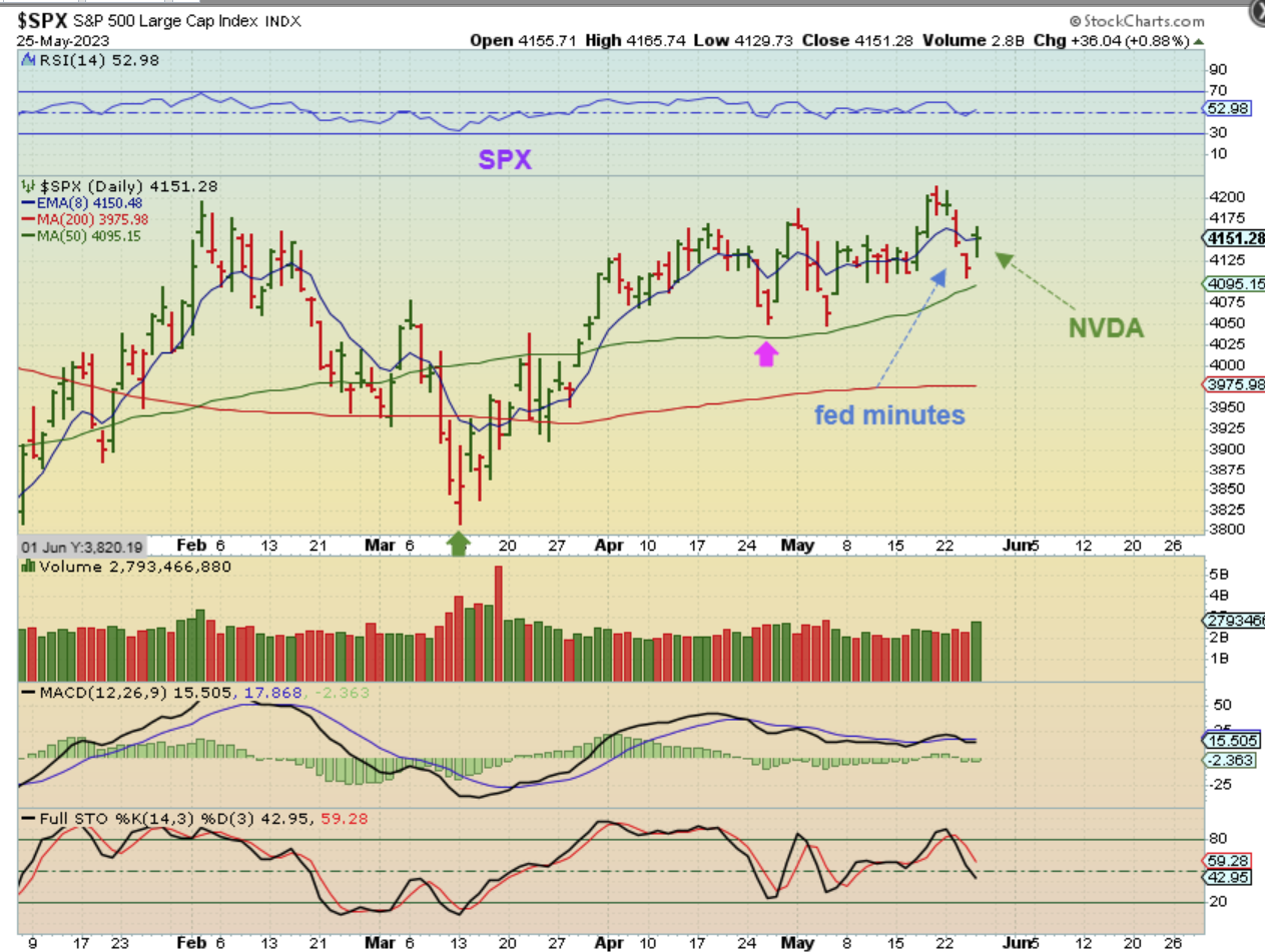 THE SPX was actually selling off this week as we headed into the Fed Minutes. The only reason I am pointing to the first dip at the green 50sma line (Day 31) is because it matches the lows in the Nasdaq and SOXX. Was that low a dcl or a 1/2 cycle low? It could be either, but the first 2 daily cycles ran 50 days long, so I chose to view it as a 1/2 cycle low. If so, the Fed Minutes drop into a dcl was interrupted yesterday when NVDA shot up almost 30% on earnings. That ‘Fed Minutes low’ was day 51, so this can rally higher (out of either a 1/2 cycle low or dcl).