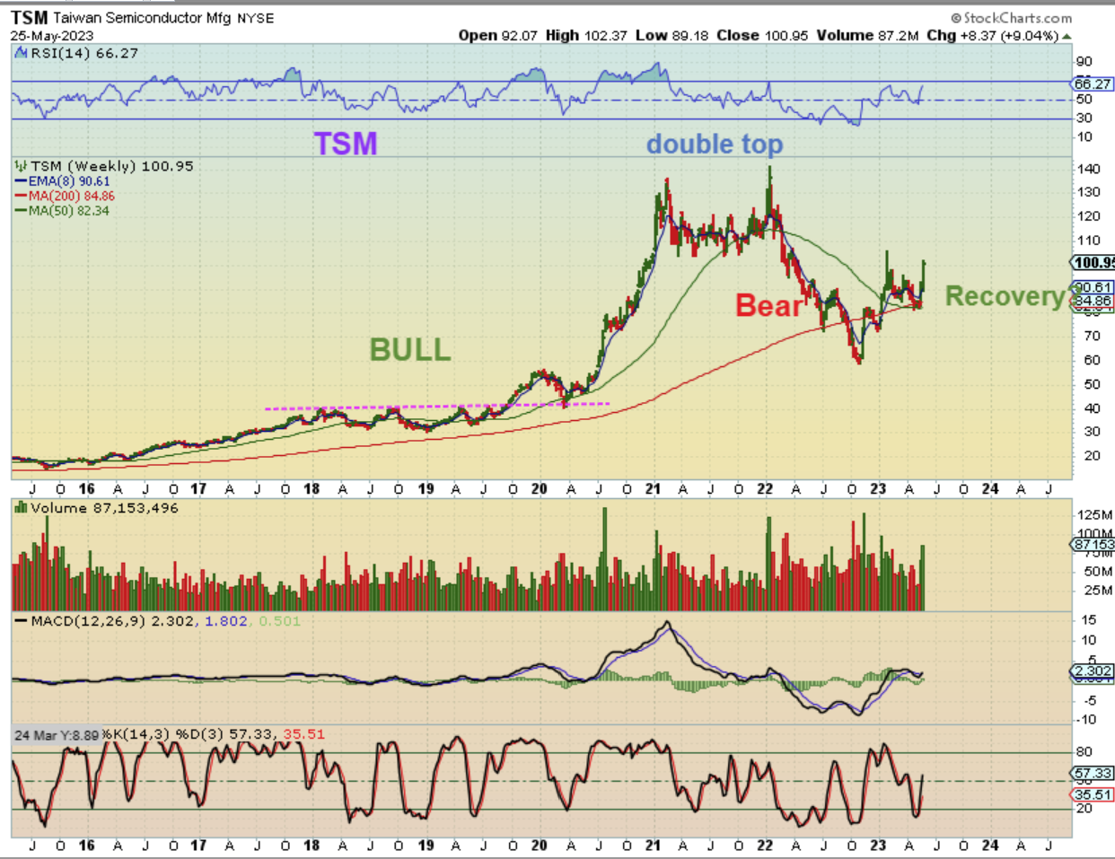 TSM SEMICONDUCTOR had a Bull Run, double topped, and dropped with the Bear Market. After a choppy low around the 200 week ma for many of these, that NVDA earnings beat sent them ripping higher and they look to be in recovery mode too.