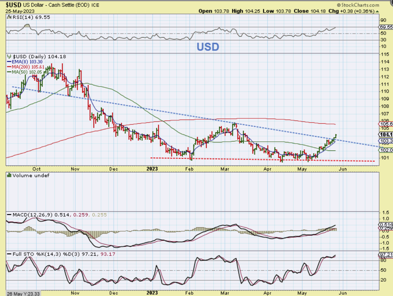 THE USD is on a slow and steady march higher. It is in the timing where it should start to drop into a dcl, but so far it has been pushing higher, sending Miners lower. The target may be 2 daily cycles higher to the 200 week ma. I’ll discuss that more in the weekend report.