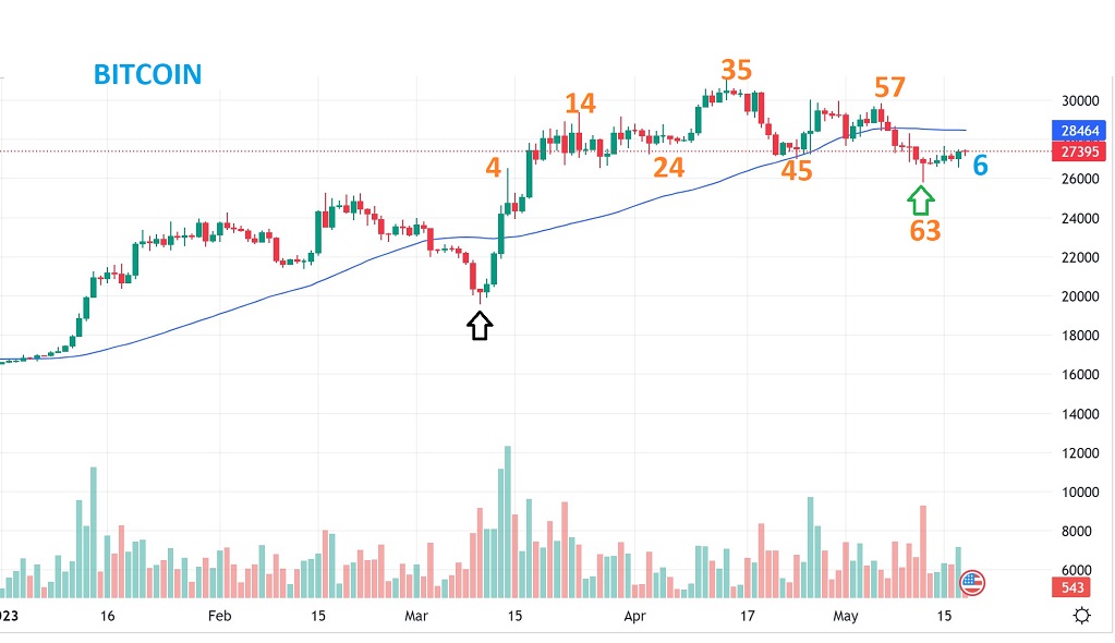 BITCOIN LIVE 6:30 am ET: This should be day 6 with a very gradual crawl out of the dcl reversal low. How are the crypto stocks responding? A bit choppy, but they look bullish…