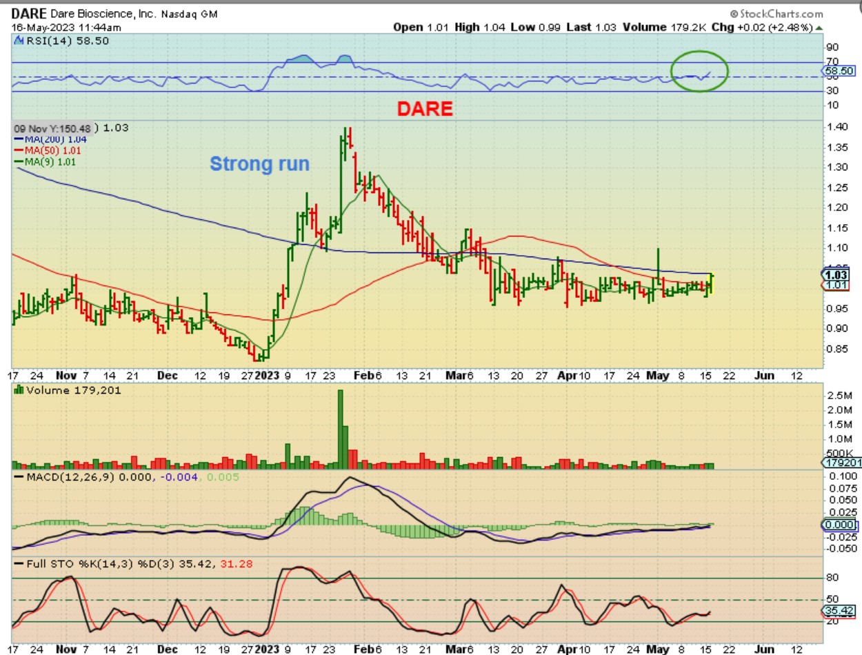 I like the set up for DARE, because it had a strong rally in January and then sold off into a base with the ICL drop. The 200sma seems to be holding it back, but break out could start it trending higher.