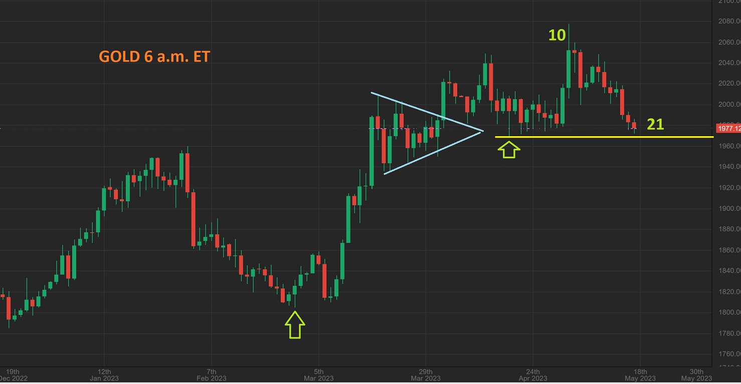 This is GOLD at 6 A.M. Thursday and you can see that it is VERY close to breaking that recent dcl. Spot Gold reads 1969.21 as the dcl, today I see 1972.05 (so far) with the USD rising again today. As mentioned in yesterdays discussion written specifically for this sector, it does not make sense for Gold to have a very strong rally out of an ICL in March, only to fail in the following daily cycle. This is an anomaly and it seems to simply be Gold vs The USD direction-wise.