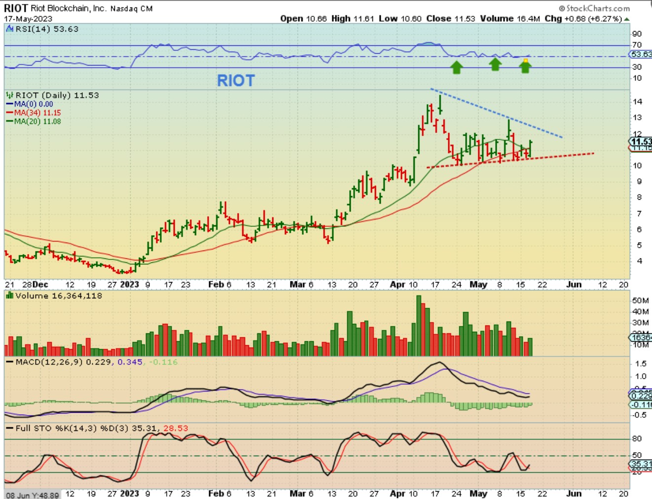 RIOT has been chopping along the 34 sma (it is above the 50sma, not shown). RIOT also released earnings last week so when bitcoin pushes higher all of these should follow.