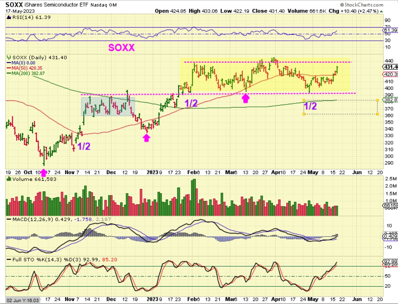 SOXX pushed higher by 2.47%, and SOXL (3X) was up by 7.24%. Also with Semiconductors AMD, MU, NVDA, etc look like Bullish charts…