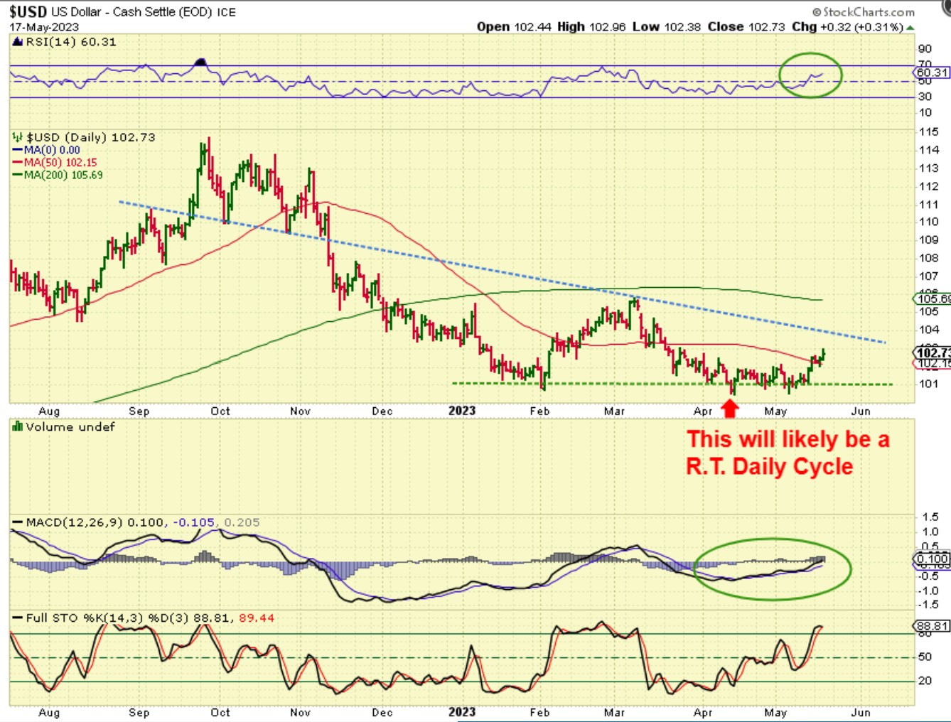 Here is the problem child. I wrote on this chart that this will likely be a R.T. daily cycle, but we did see something similar in February and it was NOT RT. In Feb the USD rally had a peak very late at the downtrend line and then roll over for so many days that it became L.T. & even broke the Feb lows.