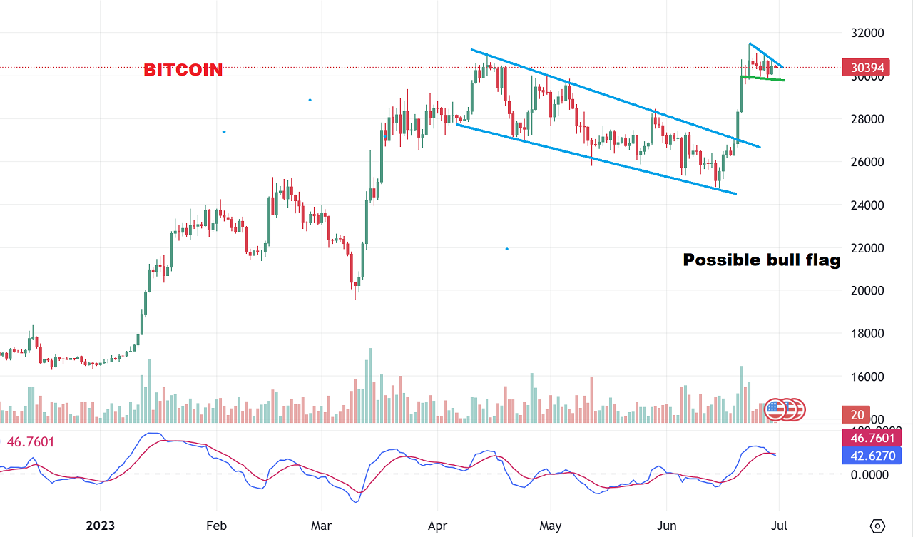 After a strong surge higher, Bitcoin is consolidating those gains. This may be a bullish pennant and I’d love to see it break higher and takes it to $35,000. Crypto Stocks have been choppy but bullish.