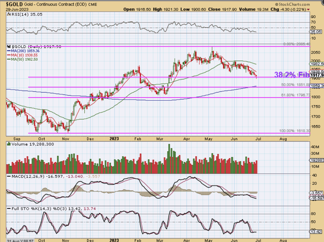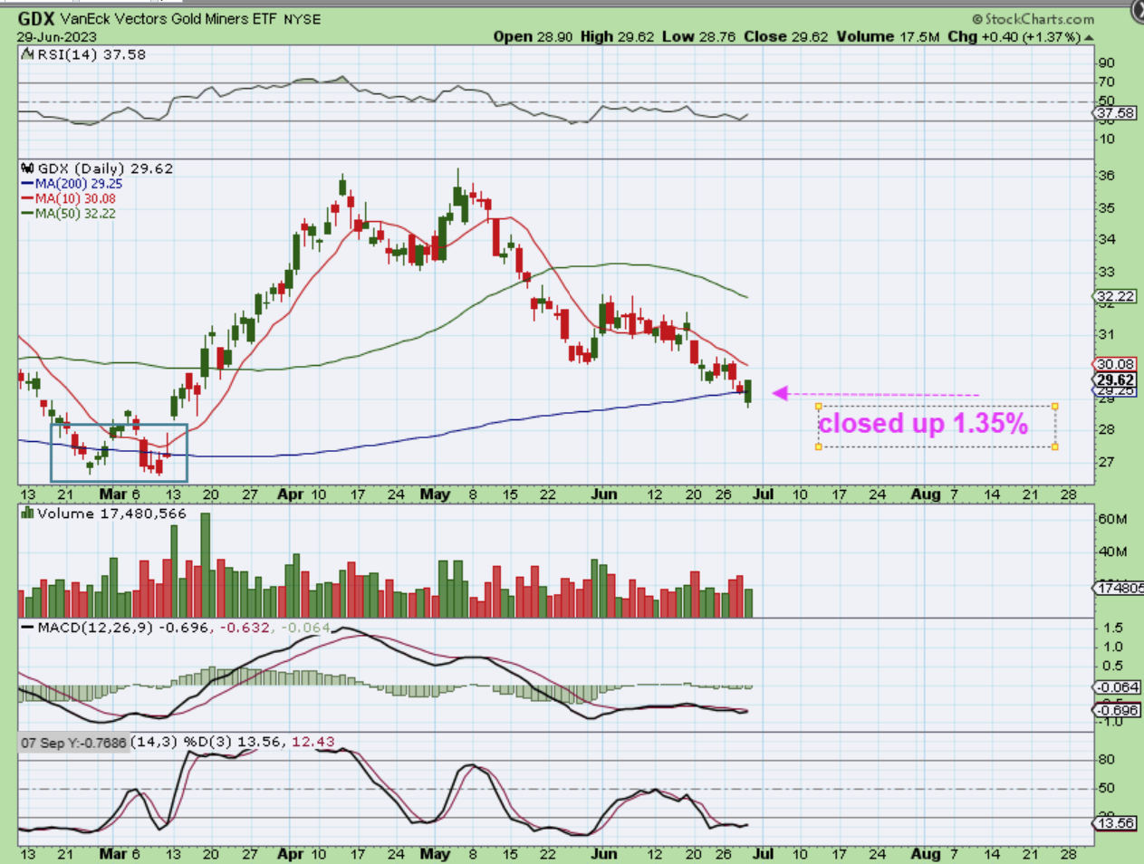 SILVER actually has a low in place at the 200sma and the 50% Fib level. That is bullish, especially because it has ignored the USD rise too. We also got a dip & reversal candle on Wednesday, but the 10sma is holding it down. Silver actually looks like a possible a-b-c drop into an ICL. If this pops higher, I think that Silver stocks would be a buy, and I’ll show you why after we discuss Silver and GDX further.
